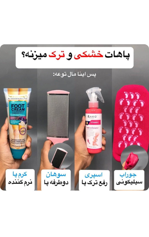 پک چهار عددی بهداشت و مراقبت پا اصلی به شرط جواب سلیکونی.رنده پا .اسپری ترک پا .کرم ترک پا